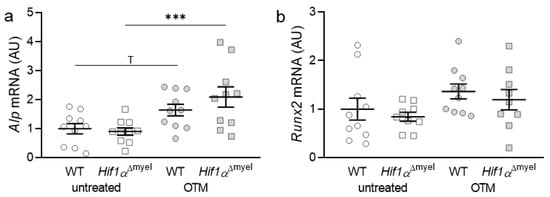 Gene expression of Alp (a) and Runx2 (b) at the orthodontically treated (OTM) and the untreated control jaw side in wildtype mice (WT) and mice without HIF1α in myeloid cells (Hif1αΔmyel). Statistics: ANOVA with uncorrected Fisher’s LSD post-hoc tests (Alp) or Welch-corrected ANOVA with unpaired t tests (Runx2). n ≥ 9; *** p ≤ 0.001, T p ≤ 0.1.