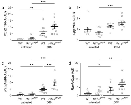 Gene expression of Ptgs2 (a), Opg (b) and Rankl (c) as well as the Rankl/Opg ratio (d) at the orthodontically treated (OTM) and the untreated control jaw side in wildtype mice (WT) and mice without HIF1α in myeloid cells (Hif1αΔmyel). Statistics: ANOVA with uncorrected Fisher’s LSD post-hoc tests (Rankl) or Welch-corrected ANOVA with unpaired t tests (Ptgs2, Opg, Rankl/Opg). n ≥ 8; * p < 0.05; ** p < 0.01; *** p < 0.001.