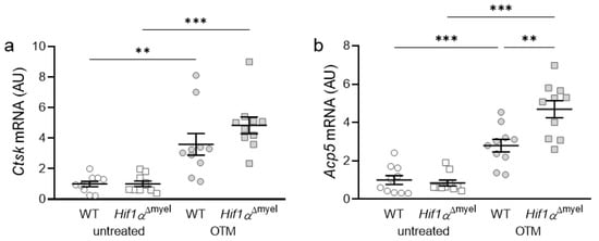 Gene expression of Ctsk (a) and Acp5 (b) at the orthodontically treated (OTM) and the untreated control jaw side in wildtype mice (WT) and mice without HIF1α in myeloid cells (Hif1αΔmyel). Statistics: Welch-corrected ANOVA with unpaired t tests. n = 10; ** p < 0.01; *** p < 0.001.