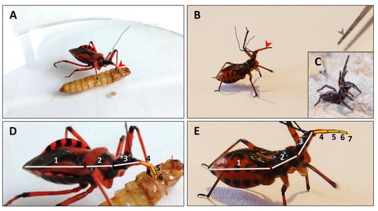 Rhynocoris iracundus using its proboscis for feeding or defense purposes. (A) R. iracundus using its proboscis (red arrowhead) to feed on a Tenebrio molitor larva. The front legs are used to grab and hold its prey. (B) R. iracundus in defense position with its elevated front legs and long proboscis (red arrowhead), ready to attack entomological forceps (gray arrowhead). (C) Defense position of a Blue Mountains funnel-web spider Hadronyche versuta with elevated front legs and chelicerae (Photo credits: with permission of Greg Bourke). (D,E) Alignment of main body and proboscis segments during feeding and defense, respectively. Body segments are shown with gray lines: abdomen (1), thorax (2), head (3), and proboscis segments are displayed as yellow lines (4–7).