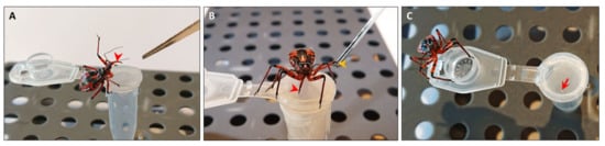Rhynocoris iracundus venom collection. (A) To stimulate defensive venom production, R. iracundus was tapped using forceps causing it to display a defense posture and to raise its proboscis. (B) Then, the assassin bug was gently pinched on a rear leg (yellow arrowhead) with forceps causing it to use its proboscis (red arrowhead) to stab through the Parafilm stretched over a microcentrifuge tube. (C) Small venom drop released by the assassin bug on the Parafilm (red arrow).