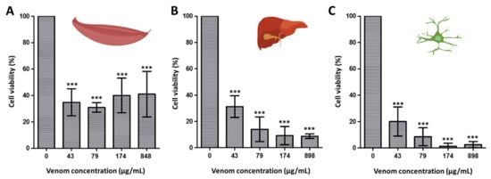 To assess the activity of R. iracundus venom on different cell types, as well as its oncological potential, we performed viability assays with cancer cells, Hepa 1–6 (murine epithelial hepatoma cells), Neuro 2a (murine neuroblastoma cells) and C2C12 (healthy mouse myoblasts) using the resazurin-based alamarBlue assay. Exposure to the lowest venom concentration (43 µg/mL) showed a significant and potent cytotoxic effect in all tested cell lines compared to the control (Figure 3).