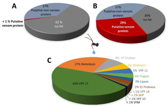 Types of transcripts found in Rhynocoris iracundus venom gland. (A) Relative proportion of venom protein encoding genes, non-venom protein encoding genes, and transcripts designated as “no-hit” (unknown). Venom protein genes account for 1% of the total transcripts (B) represents the relative transcript expression levels of the same categories. Among them, 29% of all sequence read counts of the transcripts are associated with the category “putative venom protein”. (C) Relative expression levels of toxin encoding genes only, displayed as % transcript expression of total putative venom protein encoding transcripts.