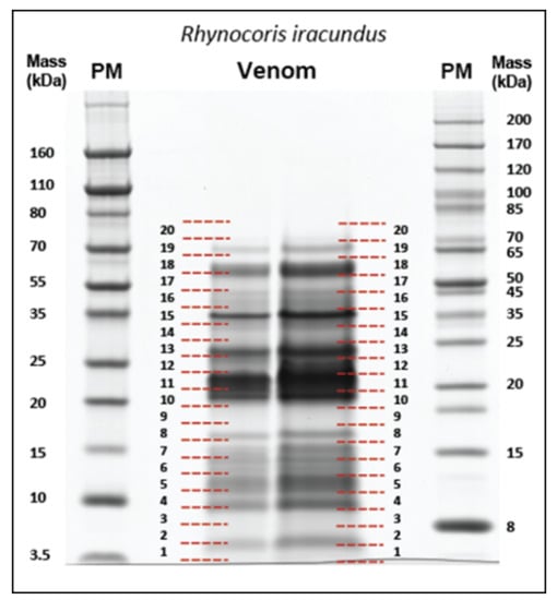 Based on the assembled venom transcriptome of R. iracundus, we broadly characterized the venom proteome by two sample runs using a standard bottom-up proteomics workflow. Venom samples were separated by SDS-PAGE (Figure 7) and both lanes were divided into 20 gel slices and subjected to in-gel digestion [43,44]. Resulting tryptic peptides were analyzed by peptide spectrum matching (PSM) based on the translated toxin sequences of the assembled transcriptome. The selected workflow does not allow any precise quantitative statements, but qualitative correlation can be achieved by identical protein matches.
