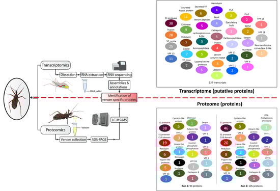 Rhynocoris iracundus transcriptome and proteome analysis workflow and identified venom protein families. In the venom gland transcriptome, 227 transcripts belonging to venom protein families were identified (top right), while venom proteome analysis resulted in the identification of 93 proteins and 105 proteins for each run, respectively (bottom right). Putative proteins and proteins belonging to the same protein family are indicated with identical colors.