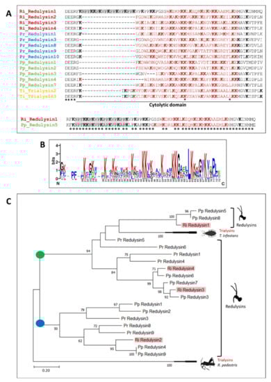 Redulyin catalytic domain characterization. (A) Cytolytic domain of redulysins from R. iracundus (Ri_Redulysin), P. rhadamanthus (Pr_Redulysin), P. plagipennis redulysin (Pp_Redulysin), and homolog trialysins from T. infestans (Ti_Trialysin). Coiled regions are highlighted in red. All Lys (K) residues are shown in bold and conserved amino acids are indicated with asterisks. Ri_Redulysin1 and Pp_Redulysin5 are aligned separately to show the high sequence similarity and the insertion in the cytolytic domain highlighted in gray. (B) WebLogo of the cytolytic domain alignment is represented by a stack of letters. The height of each letter indicates its frequency at that position of the sequence. The height of the overall stack is proportional to the sequence conservation. (C) Phylogenetic analysis of redulysins. Roots of the two main clades were highlighted in green and blue. The phylogenetic tree of all sequences mentioned above, as well as trialysins from Riptortus pedestris (Hemiptera: Alydidae) was inferred by using the Maximum Likelihood method and the Le_Gascuel_2008 model [46]. The tree with the highest log likelihood (−3253.56) is represented.