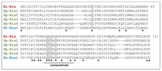 Sequence alignment of assassin bug kininogens. Kininogen sequences from R. iracundus, P. plagipennis, and P. rhadamanthus were aligned together. The conserved proteinase inhibitor cystatin site (Arg 72–Glu 85, Interproscan, IPR018073) is indicated with a line. Putative protease inhibition sites are highlighted in gray. Conserved amino acids are shown with asterisks (*).