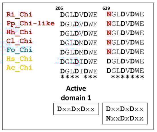In the R. iracundus proteome, we identified one chitinase. Based on the previously reported active domain motif for chitinases DxxDxDxE [47], we performed a motif search and aligned the identified active domain motifs from R. iracundus chitinase together with the chitinase-like protein from P. plagipennis (assassin bug) and the chitinases from Halyomorpha halys (stink bug), Cimex lectularius (bed bug), Frankliniella occidentalis (thrips), Harpegnathos saltator (ant), and Apis cerana (honey bee) (Figure 11). We found two conserved active domain motives D206xxD209xD211xE213 (active domain 1) and N629/D629xxD632xD634xE636 (active domain 2) (Figure 11, and Supplementary Data S3). To find out if other insect orders share Asn 629 (N629), which was found in the active domain 2 of assassin bug chitinases, we aligned 86 chitinases from eight insect orders (Supplementary Table S2). Our findings revealed that assassin bugs share N629 in the active domain 2 together with all insect orders, except for hymenopterans. The latter are the only representatives having Asp 629 (D629) in active domain 2.