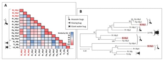 It has been previously demonstrated that redulysins are homologs of trialysins, which are Lys-rich cytolytic toxins described in the blood-feeding kissing bug Triatoma infestans [45]. The necessity of Lys (K) residues for cytolytic activity in the cytolytic region between Gly6 and Val32 of trialysin (AAL82381.1) was proven experimentally [45]. We compared the cytolytic domain of R. iracundus redulysins identified in our transcriptome analysis together with redulysins from the African assassin bug Platymeris rhadamanthus, the Australian assassin bug P. plagipennis, and trialysins from T. infestans (Figure 9A). The cytolytic domains are preceded by a conserved Asp (D)–Glu (E)–Glu (E)–Arg (R) sequence (Figure 9A). When comparing all redulysin sequences, only one of the R. iracundus redulysins (Ri_Redulysin1) have additional amino acids at the beginning of the cytolytic region. These additional amino acids are also found in one of the redulysins from P. plagipennis (Pp_Redulysin5) (Figure 9A). The last four residues of these additional amino acids align well with trialysins and show three out of four conserved residues. However, based on these data, it is not possible to state whether additional amino acids correspond to an insertion or a deletion in the rest of the sequences where additional amino acids were not detected (Figure 9A).