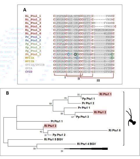 The percentage of trees in which the associated taxa clustered together is shown next to the branches. Initial tree(s) for the heuristic search were obtained automatically by applying Neighbor-Joining and BioNJ algorithms to a matrix of pairwise distances estimated using the JTT model (for redulysins and hemolysins), Le-Gascuel model (for Ptu1 family peptides) and then selecting the topology with superior log likelihood value. The tree is drawn to scale, with branch lengths corresponding to the number of substitutions per site. This analysis involved 25, 14, and 17 amino acid sequences for redulysins, hemolysins, and Ptu1 family peptides, respectively. All positions containing gaps and missing data were eliminated (complete deletion option). In the final dataset, there were a total of 112, 115, 21 positions for redulysins, hemolysins, and Ptu1 family peptides, respectively. The phylogenetic trees were inferred using MEGA X [42].