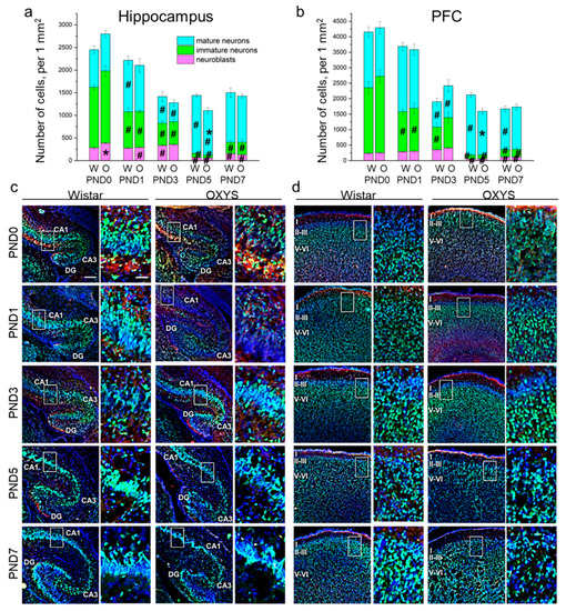 The density of neuroblasts and immature and mature neurons in the hippocampus (a) and PFC (b) of OXYS and Wistar rats during the first postnatal week. Microphotographs of the hippocampus (c) and PFC (d) stained by antibodies against NeuN (green) and DCX (red); DAPI indicates cell nuclei. Scale bars are 200 μm and 50 μm (within the frame). W: Wistar; O: OXYS; I: cortical layer I; II-III: cortical layers II–III; V-VI: cortical layers V–VI. The data (a,b) are presented as mean ± SEM; * p < 0.05 for differences between the strains; # p < 0.05 for differences from a previous time point.