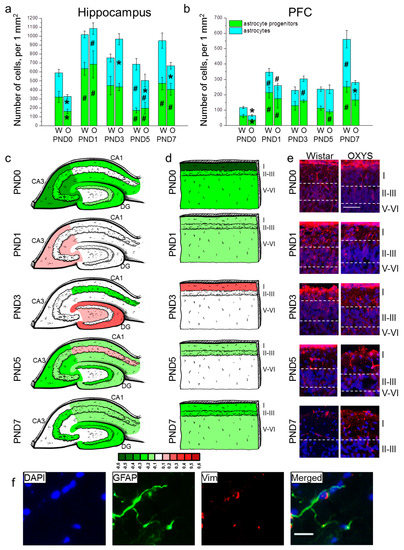 The density of astrocytes and their progenitors in the hippocampus (a) and PFC (b) of OXYS and Wistar rats during the first postnatal week. Changes in GFAP+ cell density in the regions of hippocampus (c) and layers of PFC (d) of OXYS rats compared to Wistar rats are presented schematically with GFAP+ cell density in each region and layer coded as heatmap with lg scale from −0.6 to 0.6. (e) Vimentin (red)-positive processes of radial glia in the PFC of Wistar and OXYS rats; the scale bar is 50 µm. (f) A representative image of GFAP (green)- and vimentin (red)-positive cells in the hippocampus of a Wistar rat at PND7; the scale bar is 20 µm. DAPI (blue) indicates cell nuclei (e,f). W: Wistar; O: OXYS; I: cortical layer I; II–III: cortical layers II–III; V-VI: cortical layers V–VI; Vim: vimentin. The data (a,b) are presented as mean ± SEM; * p < 0.05 for differences between the strains; # p < 0.05 for differences from a previous time point.