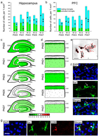 The density of microglia in the hippocampus (a) and PFC (b) of OXYS and Wistar rats during the first postnatal week. Changes in microglia density (meaning Iba1-positive cells) in regions of the hippocampus (c) and layers of the PFC (d) of OXYS rats compared to Wistar rats are presented schematically with Iba1+ cell density in each region and layer coded as a heatmap on a lg scale from −0.6 to 0.6. (e) The area of microglial cells was measured using ImageJ software. (f) A pyknotic nucleus (pointed out by a dotted arrow) covered by microglial cytoplasm. (g) A representative image of Iba1 (green)- and CD68 (red)-positive cells in the hippocampus of a Wistar rat at PND7; the arrow points to an activated microglial cell, and the arrowhead indicates a resting microglial cell. DAPI (blue) stains cell nuclei (f,g); the scale bar is 20 µm (e–g). W: Wistar; O: OXYS; I: cortical layer I; II-III: cortical layers II–III; and V-VI: cortical layers V–VI; solid arrow: an activated microglial cell; arrowhead: a resting microglial cell; dotted arrow: a pyknotic nucleus. The data (a,b) are presented as mean ± SEM; * p < 0.05 for differences between the strains; # p < 0.05 for differences from a previous time point.