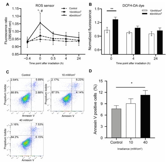 Figure 2. Blue light affects intracellular reactive oxygen species (ROS) production and apoptosis: (A) Dynamic ROS changes of HUVECs with redox sensor following blue light exposure to either low fluence (10 mW/cm2 × 12 min) or high fluence (40 mW/cm2 × 12 min). Data are shown as mean ± SD (n = 3 repetitions, * p < 0.05: 40 mW/cm2 vs. 10 mW/cm2, # p < 0.05: 40 mW/cm2 vs. control, two-way ANOVA) (B) Changes in the ROS levels in HUVECs following exposure to either low fluence (10 mW/cm2 × 12 min) or high fluence (40 mW/cm2 × 12 min), as evidenced by Dichloro-dihydro-fluorescein diacetate (DCFH-DA) assay after irradiation. Fold change was calculated versus non-irradiated controls. Data are shown as mean ± SD (n = 3 repetitions, ** p < 0.01, two-way ANOVA). (C) Representative results of Annexin V PI staining of HUVECs following exposure to either low fluence (10 mW/cm2 × 12 min) or high fluence (40 mW/cm2 × 12 min) measured by flow cytometry at 24 h after irradiation. (D) Quantification of cell apoptosis induced by blue light. Annexin V+/PI− and Annexin V+/PI+ populations were considered as apoptotic cells. Data are shown as mean ± SD (n = 3 repetitions. * p < 0.05).