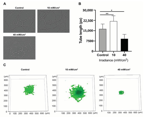Figure 4. Blue light affected tube formation and sprouting in human umbilical vein endothelial cells (HUVECs): (A) Representative images of the tube formation assay of HUVECs following exposure to either low fluence (10 mW/cm2 × 12 min) or high fluence (40 mW/cm2 × 12 min) illumination at 6 h after irradiation. (B) Quantification of data from tube formation assays. Data are shown as mean ± SD (n = 3 repetitions, * p < 0.05, ** p < 0.01, one-way ANOVA). (C) Representative images of the spheroid sprouting assay of HUVECs with GFP following exposure to either low fluence (10 mW/cm2 × 12 min) or high fluence (40 mW/cm2 × 12 min) at 6 h after irradiation.