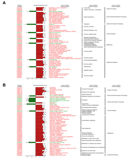 Figure 5. Kyoto Encyclopedia of Genes and Genomes (KEGG) pathway enrichment analysis of RNA sequencing: Significantly different functional KEGG categories (NES > 1.5 or <−1.5 and p < 0.05) were shown. (A) Results of low fluence (10 mW/cm2 × 12 min) versus the non-irradiated control group. (B) Results of high fluence (40 mW/cm2 × 12 min) versus the non-irradiated control group. NES: normalized enrichment score.