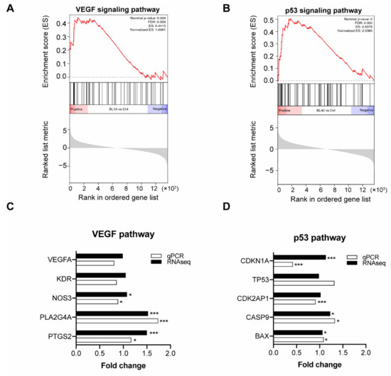 Figure 6. Gene set enrichment analysis (GSEA) and qPCR validation: (A) Vascular endothelial growth factor (VEGF) signaling pathway was upregulated in the low fluence (10 mW/cm2 × 12 min) group. (B) p53 signaling pathway was upregulated in the high fluence (40 mW/cm2 × 12 min) group. (C) qPCR validation of genes in the VEGF signaling pathway and comparison with RNA-seq data. Fold change was normalized with control (n = 3 repetitions, * p < 0.05, *** p < 0.001, Student t-test). (D) qPCR validation of genes in the p53 signaling pathway and comparison with RNA-seq data. Fold change was normalized with control (* p < 0.05, *** p < 0.001, Student t-test).