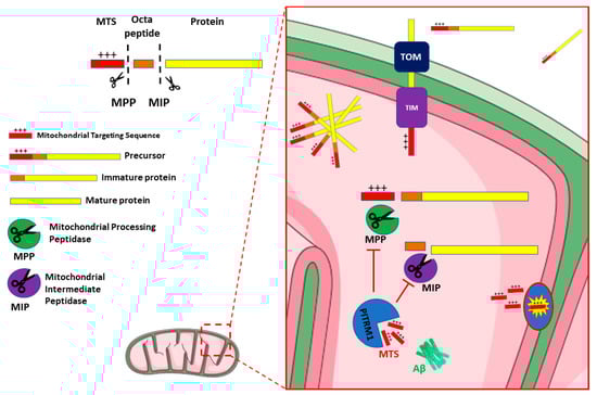 The protease-mediated quality control system is a first-line homeostatic defense against mitochondrial damage, and includes degradation of non-assembled, misfolded or damaged proteins as a result of oxidative stress, elimination of cleaved products during protein processing, and overall regulation of protein turnover and homeostasis (referred to as proteostasis) [27]. The proteolytic system in mitochondria is crucial for the maintenance of protein turnover and the integrity of mitochondria. The majority of mitochondrial proteins are synthesized on cytosolic ribosomes with an N-terminal peptide (the presequence or mitochondrial targeting sequence—MTS) which is recognized by—and binds to—specific receptors in the mitochondrial outer membrane. Following this event, these precursor mitochondrial proteins are translocated through the mitochondrial entry gate, the TOM (Translocase of Outer Membrane) complex and then, via a specific TIM (Translocase of Inner Membrane) system, TIM23, into the matrix [28], where they undergo proteolytic processes, including the cleavage of MTS, and structural modifications that lead to mature, functional proteins [29].