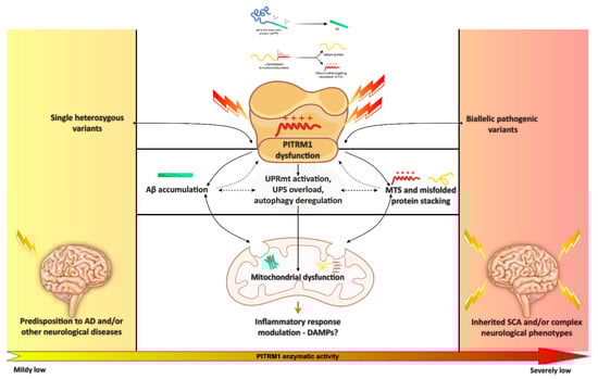 All the findings reviewed above suggest that PITRM1 deficiency induces an impairment of mitochondrial proteostasis and the activation of UPRmt, which, in turn, activates cytosolic quality control pathways such as the ubiquitin–proteasome system (UPS) and autophagy [85]. The overload of the UPS reduces the capacity to degrade cytosolic proteins, leading to APP accumulation, the rise of Aβ species, an increased Aβ42/40 ratio, and extracellular protein aggregation. Notably, boosting mitophagy via NAD+ precursors partly prevented Aβ proteotoxicity [86].
