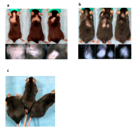 Macroscopic findings and dermoscopic findings. (a) Eight weeks after the WAS test, 25% of cchcr1−/− mice showed localized hair loss. Short stubs of hair and exclamation mark hairs were seen under dermoscopy. (b) Eighteen weeks after the WAS test on cchcr1−/− mice. Recovery from localized hair loss was evident, but the prognosis was variable, and AA-like lesions recurred in some mice. Thin hairs and white hairs were observed under dermoscopy. (c) WT mice after the WAS test.