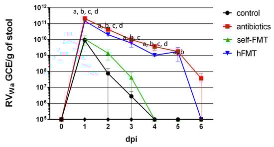 Rotavirus Wa shedding in mice stool. GCE/g of stool are presented for control mice, Ab-treated mice and mice subject to hFMT and self-FMT, respectively. The mice were followed for 6 days and euthanized on day 7. The letters indicate statistically significant differences (p < 0.05) in the GCE between the groups (a, Ab vs. control; b, Ab vs. self-FMT; c, hFMT vs. control; d, hFMT vs. self-FMT). The error bars are standard deviations (n = 5). The limit of detection was 105 GCE/g of stool. Ab, antibiotic; hFMT, human fecal microbiota transplantation; self-FMT, self-fecal microbiota transplantation.