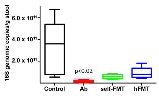 Total bacteria 16S DNA quantification by qPCR. The 16S DNA genomic copies/g of stool are presented for control mice, Ab-treated mice and mice subject to self-FMT and hFMT, respectively. Ab-treated mice had significantly lower amount of genome copies than the other three groups (p < 0.02). No significant differences were found between the human and self-transplanted groups.