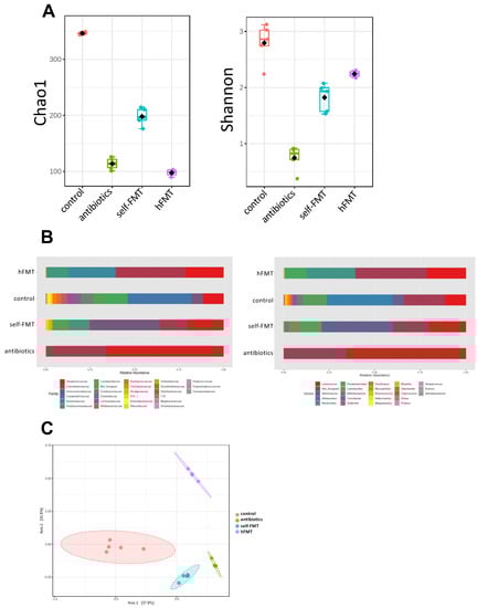 The microbiota composition in feces prior to RV challenge was determined by 16S rDNA NGS, showing that bacterial richness and diversity was severely affected after the different treatments (Figure 3A). Chao1 index was lowered in all groups compared to control (microbial richness; p = 2.0365 × 10−12; F = 206.49, ANOVA) but was higher in self-FMT animals. Diversity (Shannon index) was also lower (p = 1.8988 × 10−8; F = 57.299, ANOVA), but was higher in the hFMT group compared to self-FMT group, indicating uneven microbial distribution after treatments. In both types of analyses Ab treatment resulted in lower α diversity. As expected, the three distinct treatments caused profound remodeling of the intestinal microbial profile and all groups could be differentiated in terms of overall composition (Figure 3B,C). In mice treated with Ab, members of the phyla Firmicutes and Proteobacteria, belonging to the genus Lactococcus and unidentified γ-Proteobacteria (enterobacteria), respectively, accounted for most of the microbiota (Figure 3B).