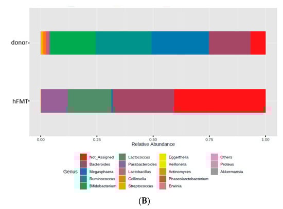 Relative abundances of bacterial taxa (family and genus) in donor feces and feces of mice subject to hFMT. The panel (A) shows the relative abundance of bacteria at family level of the donor sample while panel (B) shows the same at genus level.