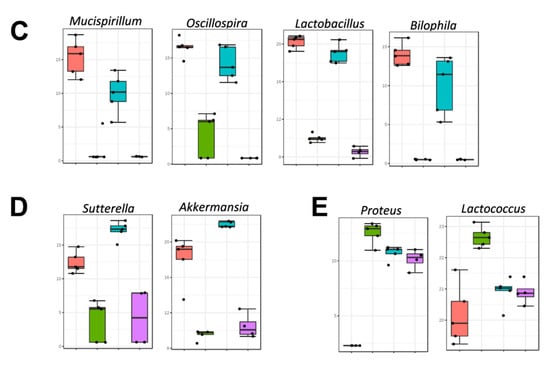 Total rDNA 16S in mice feces was quantified by qPCR as previously described [19]. To assess microbiota composition, DNA was extracted from mice fecal pellets obtained prior to RVwa inoculation from all experimental groups with the Master Pure™ kit (Epicentre), including a bead beater treatment with 0.5 g of 0.1 mm glass beads in the lysis step (FastPrep 24-5G Homogenizer; MP Biomedicals, CA, USA), followed by final purification of the extracted DNA samples with mi-PCR Purification kit (Metabion, Planegg-Steinkirchen, Germany). DNA was quantified with a Qubit 2.0 fluorometer (Invitrogen, Thermo Fisher Scientific, Madrid, Spain). Bar-coded amplicons of the 16S rDNA V3–V4 region, multiplexed using Nextera XT Index Kit, were subject to 2 × 300 bp paired-end run in a MiSeq-Illumina platform (SCSIE, University of Valencia, Valencia, Spain). Data were demultiplexed using Illumina bcl2fastq© program and reads were checked for quality, adapter trimmed and filtered using AfterQC and FastQC v0.11.8 (http://www.bioinformatics.babraham.ac.uk, accessed 10 May 2021) tools. QIIME software V1.9.1 [20] was used to analyze MiSeq sequencing data, including forward and reverse reads joining, chimera removal, data filtering, and taxonomic annotation. Chimeric sequences were removed from the reads using the USEARCH 6.1 algorithm. Reads were clustered into operational taxonomic units (OTUs) based on a 97% identity threshold value. Sequence were aligned to the Greengenes core reference database (version 13.8) using PyNAST. Taxonomic assignment was made using the UCLUST classifier. A total of 4,356,240 non-chimeric reads were obtained, with a mean of 207,440 sequences per sample. Datasets were rarefied to the minimum library size (43,791 reads) and normalized by total-sum scaling prior analysis with Calypso 8.84 (http://cgenome.net/calypso/ accessed 10 May 2021) and MicrobiomeAnalyst (https://www.microbiomeanalyst.ca/ accessed 10 May 2021; [21] software pipelines.