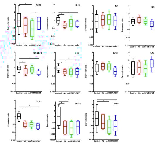Gene expression levels of a panel of cytokines and other innate immune system mediators including IL1β, IL4, IL6, CXCL15, IL10, IL12, IL13, IFNγ, TNFα, and TLR2 were studied by RT-qPCR in the small intestine of mice at 7 dpi (Figure 6). IL6, IL12, and IL13 expression levels did not differ between experimental groups and control animals, whereas a downregulation effect was generally observed in the remaining tested genes. IL1β and CXCL15 messenger levels were lower in the Ab and hFMT groups where human rotavirus replicated more efficiently. Expression of IL10, TLR2, and TNFα was also reduced in all groups compared to control. Finally, IFNγ expression was diminished in mice subject to both FMT treatments. Expression of the FUT2 gene, whose product is involved in α1,2-fucosylation during the synthesis of mucosal H type-1 antigen (fucosyl-α1,2-galactopyranosyl-β1,3-N-acetyl-glucopyranoside), one of the P[8] RV adhesin receptors, was downregulated in self-FMT animals. Interestingly, the FUT2 gene expression differed between both transplanted groups, having a higher expression (p = 0.003) in the group that received the human feces transplant (Figure 6). More interestingly, a significant negative correlation was found between the expression level of IL1β and the rotavirus shedding in feces at 2 dpi (Pearson r = −0.7203, p = 0.0005). More moderate correlations were also found with TLR2 (Pearson r = −0.5824, p = 0.0089) and TNFα (Pearson r = −0.4654, p = 0.0446).