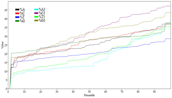 Nucleotide %A values ranged between 12.28% (CDKN2A) and 37.04% (KRAS), %C ranged between 14.10% (KRAS) and 37.14% (GATA2), %T ranged between 13.84% (TCF3) and 28.66% (ATM), and %G ranged between 20.42% (BLM) and 37.84% (CDKN2A). Among all the nucleotides, %T representation was the lowest and is depicted by a percentile graph (Figure 1). Percent GC components at all positions (overall %GC, %GC1, %GC2, %GC12, and %GC3) were determined, plotted, and are presented in Figure 2, showing that the maximum variation in composition occurred in %GC3.
