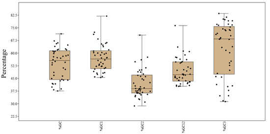 Jitter and boxplot showing percent occurrence of GC components at all positions.