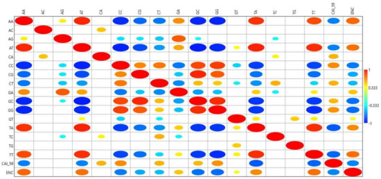 The CpG and TpA dinucleotide combination is commonly underrepresented [17,26]. A correlation analysis between the frequency of 16 dinucleotides with CAI-59 revealed that among CpG and TpA, the two nucleotides at those frequencies are strongly driven by selectional force [17]; CpG did not correlate with CAI-59, while TpA negatively correlated (r = −0.770, p < 0.0001). CAI-59 correlated negatively with AA, AT, TA, and TT and positively with CA, CC, CT, GC, and GG (r = 0.535, p < 0.001; r = 0.643, p < 0.001; r = 0.538, p < 0.001; r = 0.518, p < 0.001 and r = 0.621, p < 0.001, respectively). AC and TG dinucleotides positively correlated with their palindromic dinucleotides (CA and GT only). A correlation analysis of the odds ratios with ENc to determine CUB revealed a correlation (p < 0.05) in all dinucleotide combinations except for AC, AG, CA, TC, and TG (Figure 4).