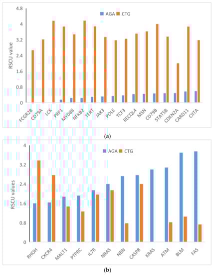 RSCU analysis of 59 codons (methionine, tryptophan, and stop codons were excluded) indicated low usage of codons ending in A and T while codons ending in C and G were preferred, with high RSCU (Figure 5). Codon CTG was overrepresented in most genes. The CTG codon was overexpressed in all the genes except for a few (overrepresentation [RSCU > 1.6] in 80.95% of genes; underrepresentation [RSCU = 0] in 2.38% of genes; random usage (1.6 > RSCU > 0.6) in 16.66% of genes]. Despite general overrepresentation, this codon was not used by the KRAS gene (RSCU = 0). The RSCU value was highest for CTG in the NFKB2 gene (RSCU = 4.17). Plots of underrepresented AGA (RSCU < 0.6) with corresponding CTG usage and overrepresented AGA (RSCU > 1.6) are depicted in Figure 6a,b, respectively. Notably, these results indicate that the AGA codon was underrepresented and the CTG codon overrepresented (Figure 6a,b). A correlation analysis between AGA and CTG revealed a very high negative correlation (r = −825, p < 0.0001). However, AGA and CTG were not mutually exclusive, and in a few genes, both AGA and CTG were overrepresented.