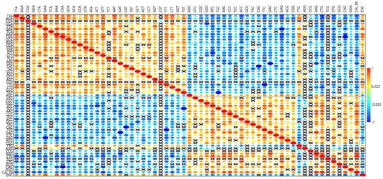A correlation analysis was performed between the RSCU values and CAI-59 to elucidate the relationship between the relative frequency of codon usage and gene expression (Figure 7). CGA, CGT, AGG, CCG, TCG, and GCG did not correlate with CAI-59. The CGA codon frequency only correlated with CGT (r = −0.337, p < 0.05), while CGT correlated with CGA (r = −0.270, p < 0.05), TGT (r = −0.380, p < 0.05), TGC (r = −0.381, p < 0.05), and GCT (r = −0.405, p < 0.05). All other codons correlated with at least ten other codons. All codons ending with CG negatively correlated with codons ending in AT except for TTG and AGG, which positively correlated with codons ending in AT and negatively correlated with codons ending in GC.