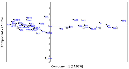 To further analyze the codon usage patterns in genes common in PIDs and cancers, PCA analysis was performed to determine the distribution of 59 independent variables [27]. The distribution of each vector is depicted in Figure 8. The PCA analysis indicated that the first four axes contributed 54.94%, 7.03%, 5.06%, and 4.08% of all variation, respectively, for a total of 71.11%.