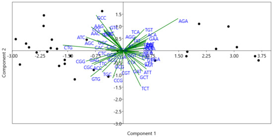 Biplot analysis (Figure 9) shows genes and the variable projections to the first two axes simultaneously. The length of the arrow indicates the most influential vectors with the highest loading values [28]. CTG and AGA codons had the highest loading values across PC1, while codons TCT and GCC had the highest loading values across PC2.