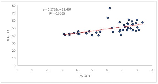 The %GC3 values ranged between 31.25% to 83.49%, while the average GC12% value ranged between 40.31% and 76.31%. The linear regression model of GC12 on GC3 indicated (GC12%) = 0.2718 (GC3%) + 32.468, with R2 = 0.316. This meant that relative neutrality was 27.18%, while the contribution of selectional forces was 72.82%. The plot also indicated that GC3 is responsible for 31.6% of the variation in GC12. (Figure 11) This result shows a high correlation between GC12 and GC3, indicating that the directional mutational force acted on all codon positions [29].