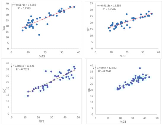 Regression analysis between the overall nucleotide composition and composition at the third position of the codon.