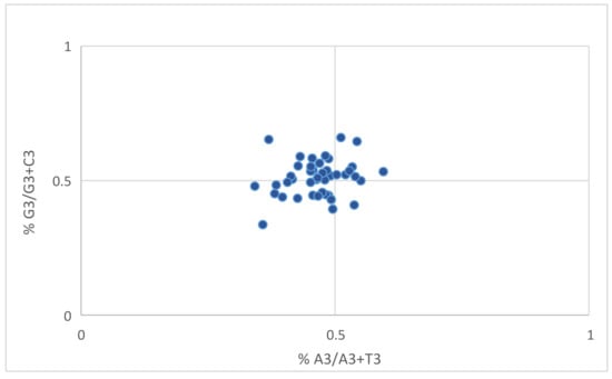 The overall %A, %T, %G, and %C were analyzed, and %A3, %T3, %C3, and %G3 (nucleotide occurrence at the third codon position) were also evaluated and used for parity analysis. The average %GC12 (G/C present at the first and second positions) and %GC3 (G/C present at the third position) were calculated to obtain neutrality. Informatics software CodonW 1.4.4, (an open source software by John F. Peden) available at http://codonw.sourceforge.net (accessed on 26 June 2021), was used for these calculations.