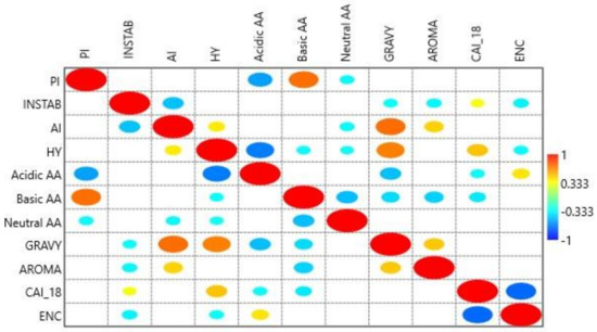 A mirror image plot depicting the correlation between CAI-18 and different protein indices. A bigger-sized eclipse described a higher Pearson’s correlation coefficient (r) value, and vice versa. The red color shows a positive correlation, whilst blue indicates a negative correlation. Empty boxes show an insignificant correlation.