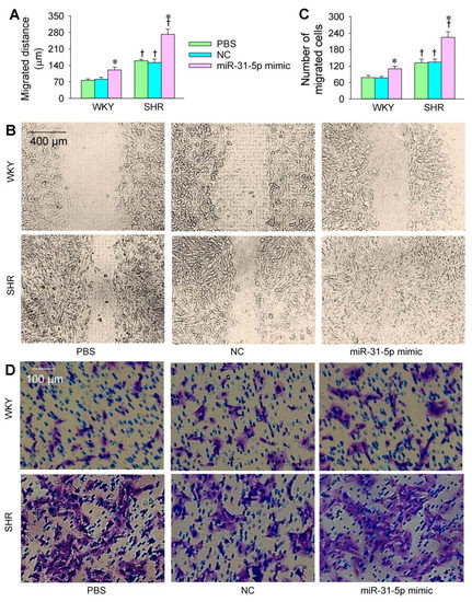 Effects of the miR-31-5p mimic on the VSMC migration of WKY and SHR. The measurements were made after treatment with PBS, normal control (NC, 50 nmol/L), or miR-31-5p mimic (50 nmol/L) for 24 h. (A,B) VSMC migration was determined with a wound healing assay; (C,D) VSMC migration was evaluated with a Boyden chamber assay. Values are mean ± SE. * p < 0.05 vs. PBS or NC; † p < 0.05 vs. WKY. n = 6 per group.