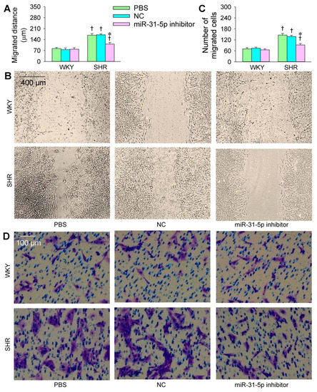 Effects of the miR-31-5p inhibitor on the VSMC migration of WKY and SHR. The measurements were made after treatment with PBS, normal control (NC, 100 nmol/L), or miR-31-5p inhibitor (100 nmol/L) for 24 h. (A,B) VSMC migration was determined with a wound healing assay; (C,D) VSMC migration was evaluated with a Boyden chamber assay. Values are mean ± SE. * p < 0.05 vs. PBS or NC; † p < 0.05 vs. WKY. n = 6 per group.