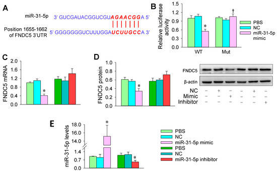 FNDC5 is one of the targets of miR-31-5p in A7r5 cells. (A) Predicted location of the miR-31-5p combination according to TargetScanHuman. (B) Relative luciferase activity in A7r5 cells. The cells were transfected with pcDNA-FNDC5-WT or pcDNA FNDC5-mut plasmids, followed by PBS, normal control (NC, 50 nmol/L), or miR-31-5p mimic (50 nmol/L) treatment for 24 h. (C) Effects of the miR-31-5p mimic and inhibitor on FNDC5 mRNA expression. (D) Effects of the miR-31-5p mimic and inhibitor on FNDC5 protein expression. (E) Effects of the miR-31-5p mimic and inhibitor on miR-31-5p levels. Measurements were performed after treatment with PBS, normal control (NC, 50 nmol/L), miR-31-5p mimic (50 nmol/L), or miR-31-5p inhibitor (100 nmol/L) for 24 h. Values are mean ± SE. * p < 0.05 vs. PBS or NC; † p < 0.05 vs. WT. n = 3 per group.