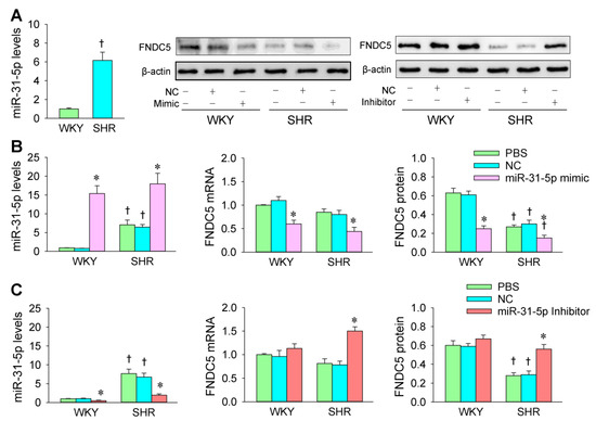 Levels of miR-31-5p and effects of the miR-31-5p mimic and inhibitor on the FNDC5 expression in the VSMCs of WKY and SHR. (A) miR-31-5p levels in the VSMCs. (B) Effects of the miR-31-5p mimic on miR-31-5p, FNDC5 mRNA, and protein expression in VSMCs. (C) Effects of the miR-31-5p inhibitor on miR-31-5p, FNDC5 mRNA, and protein expression in VSMCs. The measurements were performed after treatment with PBS, normal control (NC, 50 nmol/L), miR-31-5p mimic (50 nmol/L), or miR-31-5p inhibitor (100 nmol/L) for 24 h. Values are mean ± SE. * p < 0.05 vs. PBS or NC; † p < 0.05 vs. WKY. n = 3 per group.