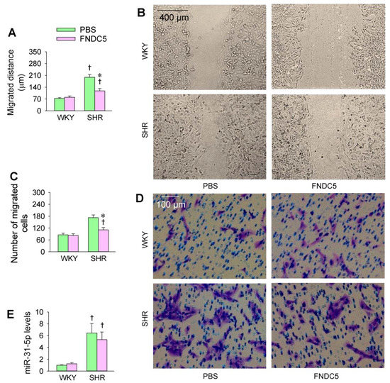 Effects of exogenous FNDC5 on VSMC migration and miR-31-5p levels in WKY and SHR. The measurements were made after treatment with PBS or FNDC5 (200 nmol/L) for 24 h. (A,B) VSMC migration was evaluated with a wound healing assay. (C,D) VSMC migration was determined with a Boyden chamber assay. (E) miR-31-5p levels. Values are mean ± SE. * p < 0.05 vs. PBS; † p < 0.05 vs. WKY. n = 6 per group.