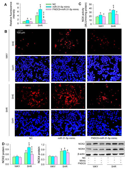 Effects of exogenous FNDC5 on miR-31-5p mimic-induced oxidative stress in VSMCs of WKY and SHR. The measurements were made after treatment with normal control (NC, 50 nmol/L), miR-31-5p mimic (50 nmol/L), or FNDC5 (200 nmol/L) and miR-31-5p mimic (50 nmol/L) for 24 h. (A,B) ROS production was detected by dihydroethidium (DHE) fluorescent staining (red), and cell nuclei were stained with DAPI (blue). (C) NOX activity. (D) NOX2 and NOX4 protein expression. Values are mean ± SE. * p < 0.05 vs. NC; † p < 0.05 vs. miR-31-5p; ‡ p < 0.05 vs. WKY. n = 6 per group in (A–C); n = 3 per group in (D).