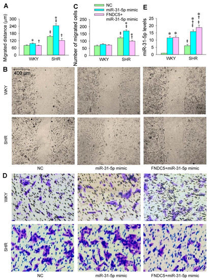 MicroRNAs (miRNAs) are a class of endogenous, non-coding small RNAs (about 18–22 nucleotides) that negatively regulate gene expression by binding to the mRNAs of target genes, specifically on a posttranscriptional level [19]. The dysregulation of miRNAs contributes to the pathogenesis of oxidative stress [20,21], inflammation [22], and several diseases such as cancer [23] and vascular diseases [24,25]. miR-31-5p inhibits the cell migration of renal cell carcinoma [26] and hepatocellular carcinoma [27], but it promotes cell migration in colorectal cancer cells [28]. Moreover, miR-31 was found to promote the proliferation and migration of human VSMCs pretreated with platelet-derived growth factor-BB (PDGF-BB) by targeting mitofusin-2 [29]. However, it is unknown whether miR-31-5p is involved in oxidative stress. The role of miR-31-5p in VSMC migration remains unknown. The authors of the present study aimed to investigate the role of miR-31-5p and its relation to FNDC5 in the oxidative stress and VSMC migration in hypertension.