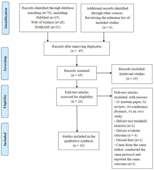 Types of intervention: treadmill exercise (TE) training without any restriction of the protocol. The information about timing, duration, and frequency must be provided. Studies that evaluated the effects of TE in combination with the other therapies were excluded.