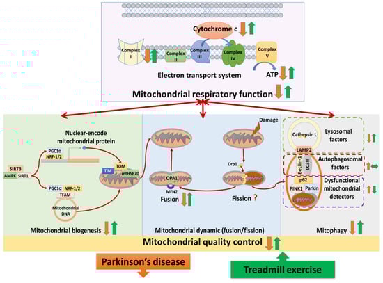In the current review, we found that treadmill training activated neural mitochondrial fusion in Parkinson’s disease, as evidenced by increases of mitochondrial fusion factors (OPA-1 and MNF-2) after treadmill training in the Parkinsonian brain [15,23]. Supportively, a previous study showed that 12-week treadmill training increased the levels of fusion proteins (OPA-1 and MNF-2) in the hippocampus of an Alzheimer’s disease mouse model [36]. The improvement of neural mitochondrial fusion could reduce the genome mutations and protect the healthy neural mitochondria against the neurodegenerative progression.